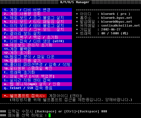 | 1. °èÁ¤ & µðºñ ºñ¹ø º¯°æ | °èÁ¤ºñ¹øÀº ftp & telnet & ssh & mail Á¢¼Ó½Ã °øÈ÷ »ç¿ëµË´Ï´Ù. |
